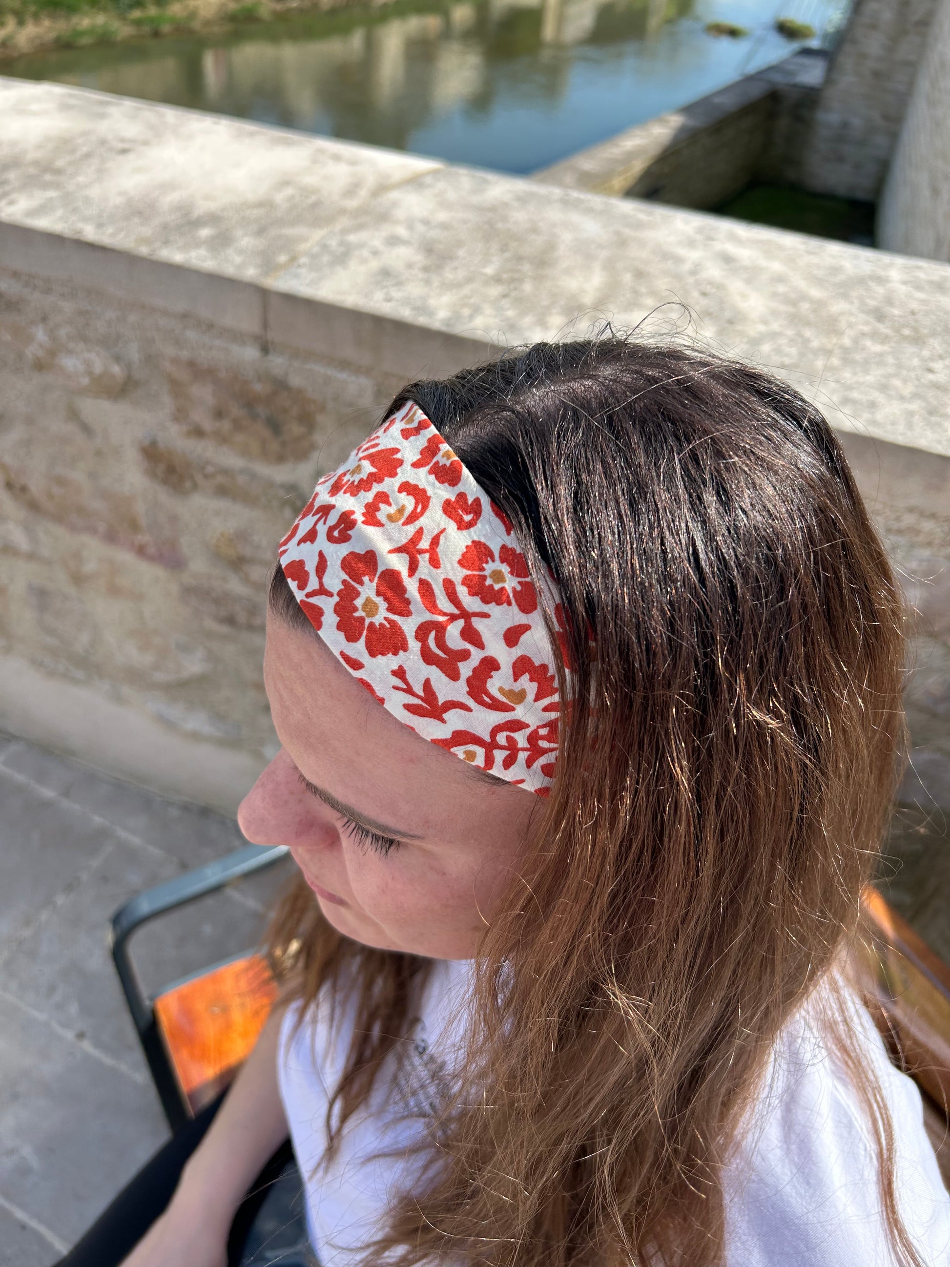 Bandeau Zouzou à motif floral orange et beige - Cousu à la main, made in France🌸