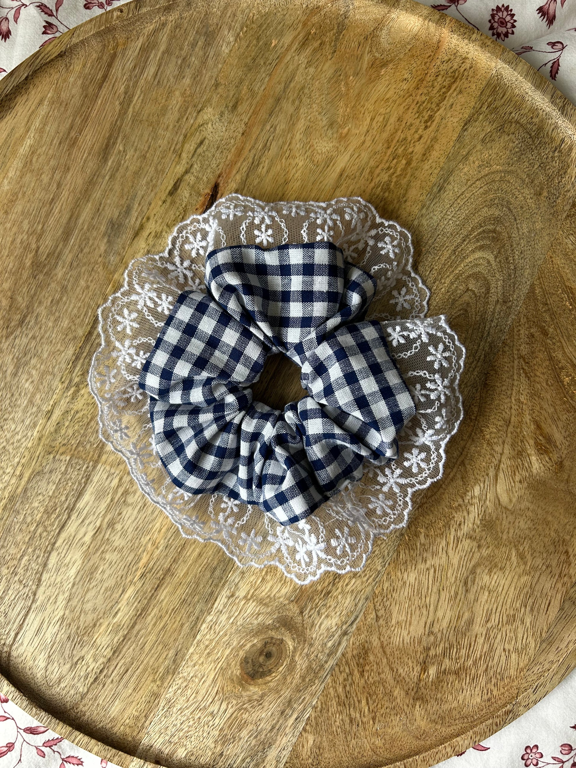 Chouchou vichy bleu dentelle - Cousu à la main, made in France🌸