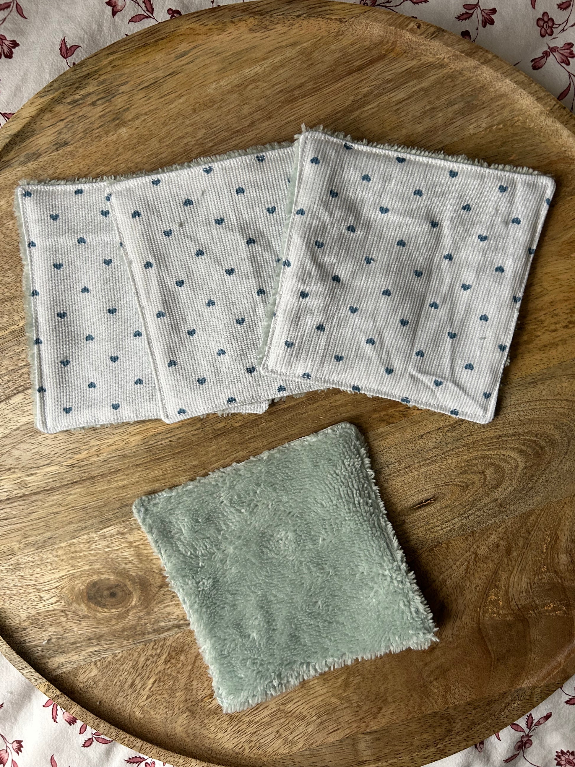 Lot de 4 cotons coeurs bleu/éponge blanche - Cousu à la main, made in France🌸