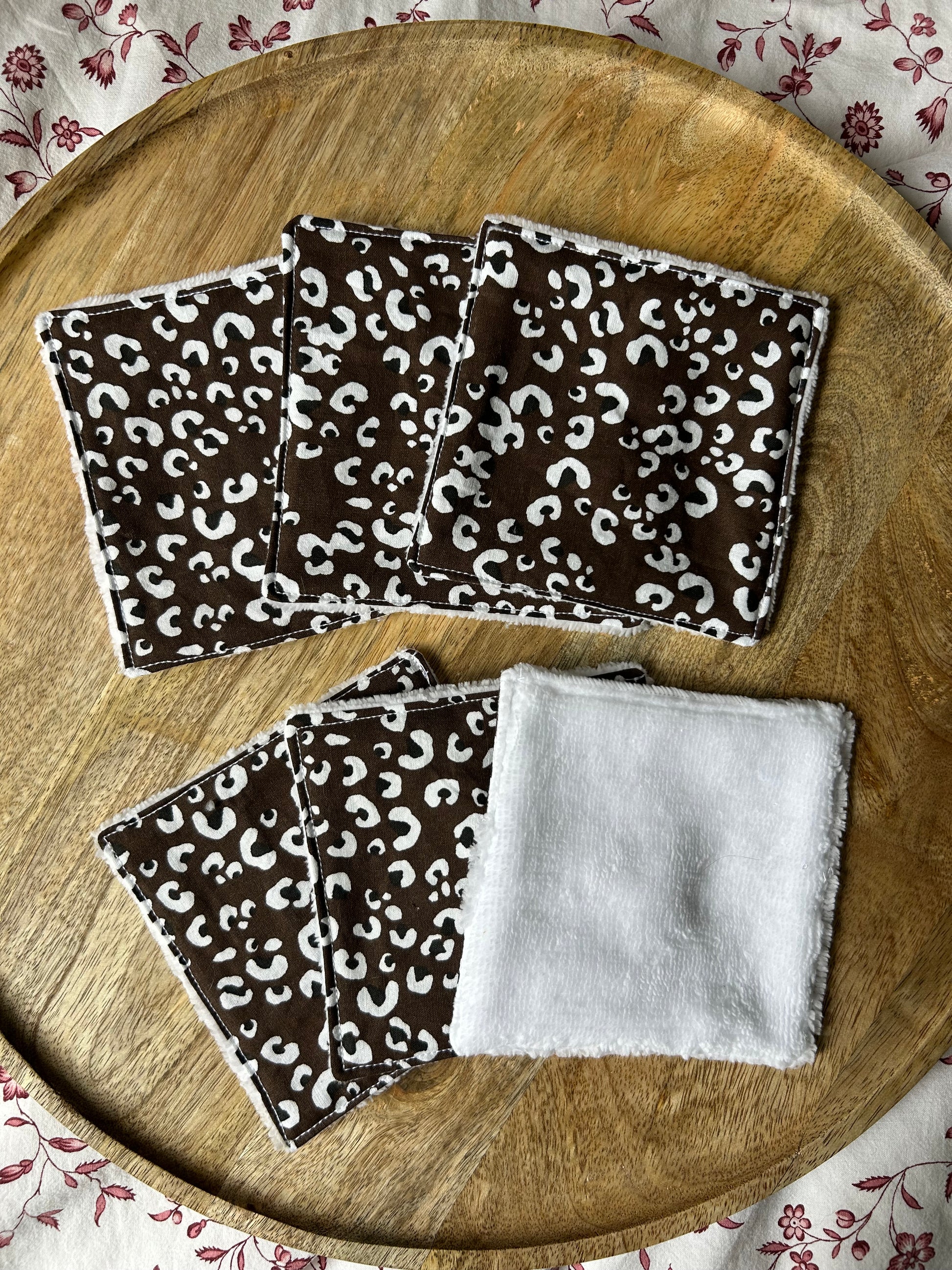 Lot de 6 cotons léopard marron/éponge blanche - Cousu à la main, made in France🌸