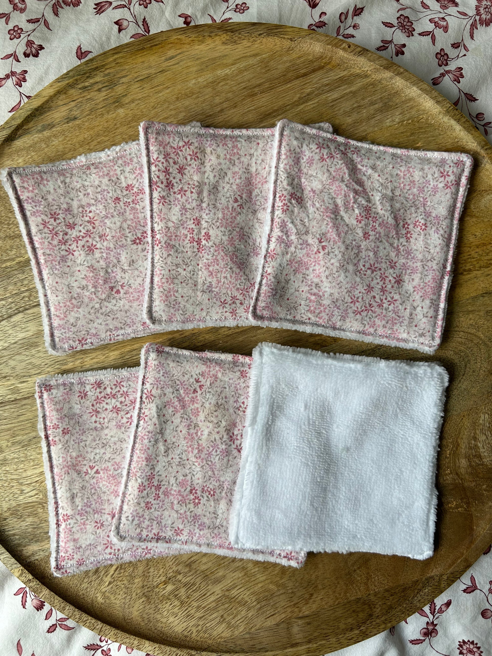 Lot de 6 cotons rose fleuri/éponge blanche - Cousu à la main, made in France🌸