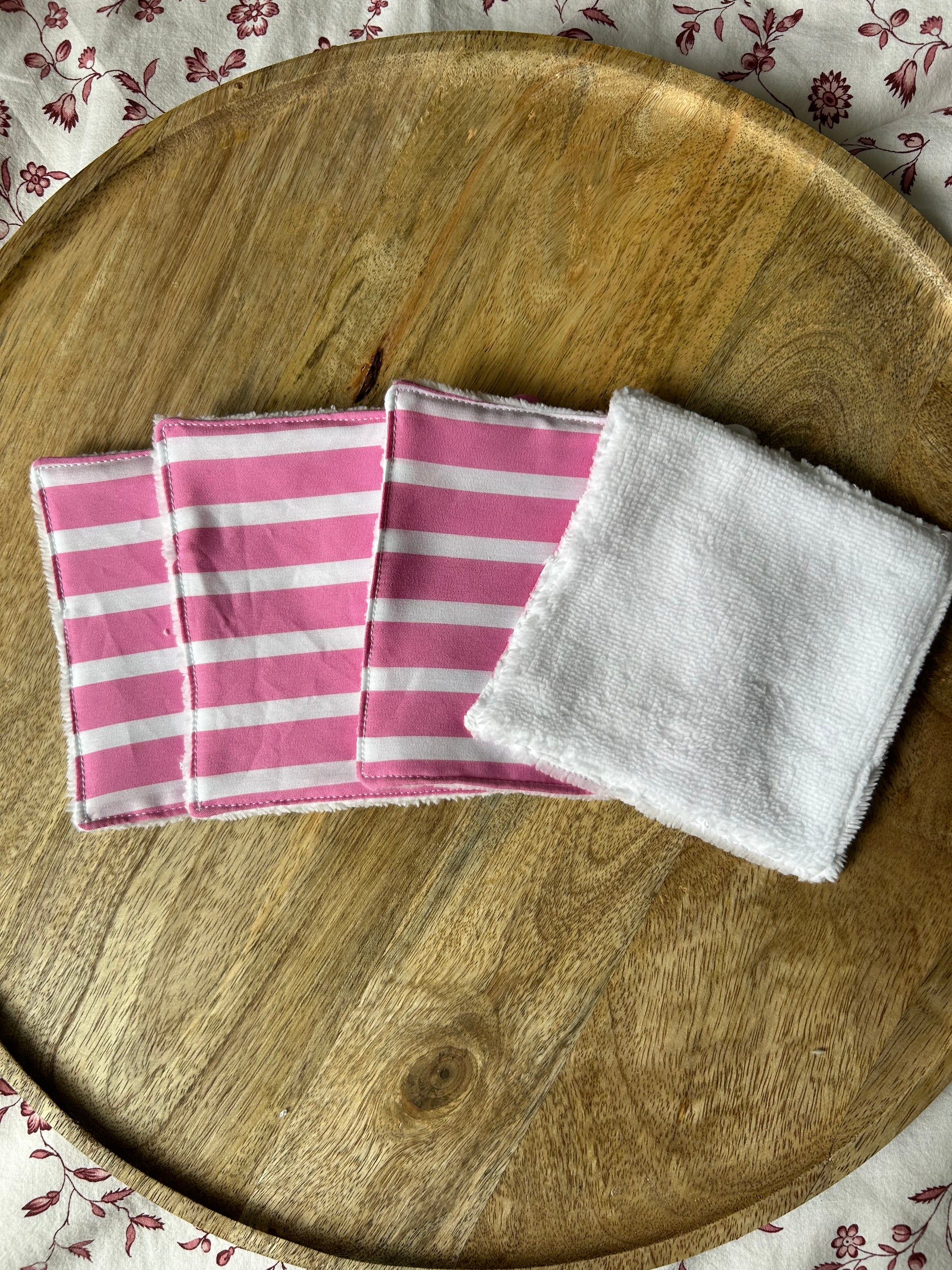 Lot de 4 cotons rose et blanc à rayures/éponge blanche - Cousu à la main, made in France🌸